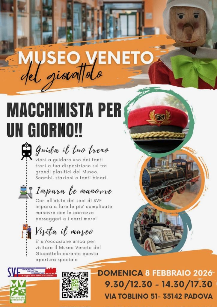 Domenica 8 febbraio presso il Museo Veneto del Giocattolo in via Toblino 51 a Padova si terrà la manifestazione in oggetto indicata, chi lo vorrà potrà condurre uno dei diversi convogli in scala H0 disponibili sul nostro plastico in scala H0, presente presso il Museo veneto del Giocattolo, u